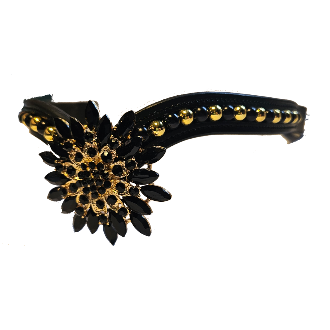 Tøff pannereim til en tøff hest, i gull og sorte perler, med matchene midstykke.